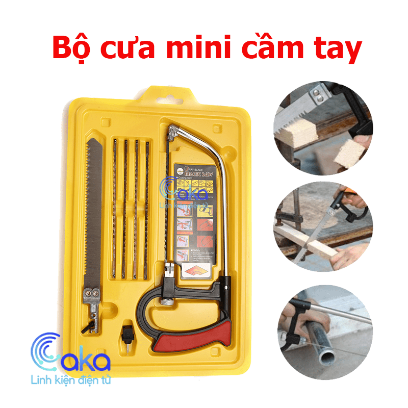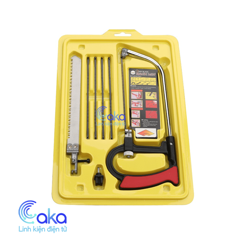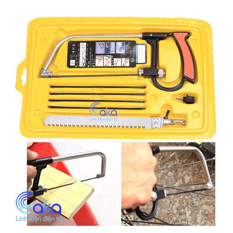 Bộ cưa cầm tay đa năng gồm: 1 khung cưa, 1 cán cưa, 5 lưỡi cưa với răng cưa nhỏ để cưa vật cứng như nhôm, sắt, gạch, 1 lưỡi cưa với răng cưa lớn để cưa gỗ, tre, nhựa nhanh hơn.