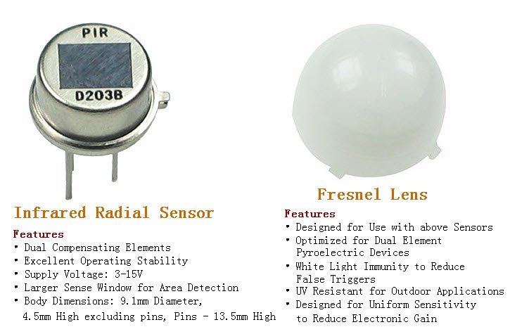 Một bộ phận khác là đầu dò PIR, loại bên trong gắn 2 cảm biến tia nhiệt, nó có 3 chân ra, một chân nối masse, một chân nối với nguồn volt DC, mức áp làm việc có thể từ 3 đến 15V. Góc dò lớn. Để tăng độ nhậy cho đầu dò, bạn dùng kính Fresnel, nó được thiết kế cho loại đầu có 2 cảm biến, góc dò lớn, có tác dụng ngăn tia tử ngoại.