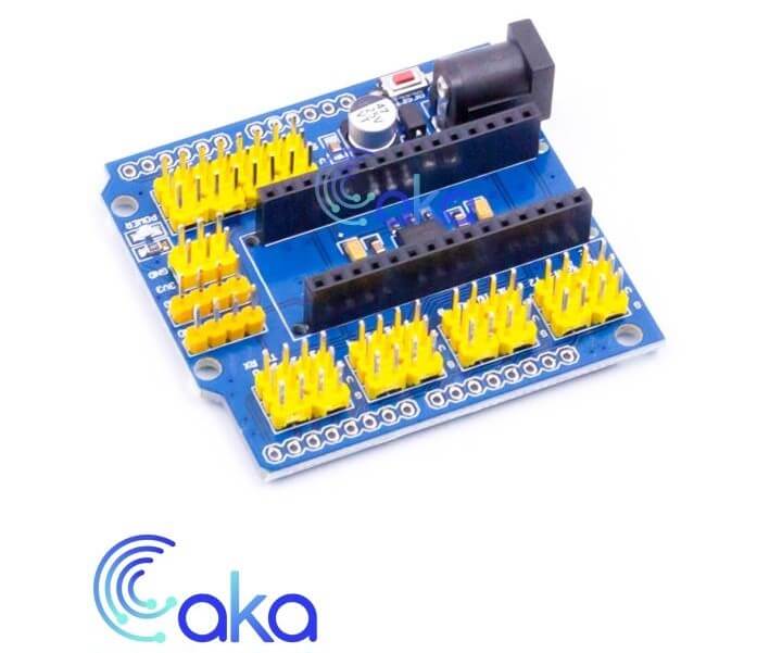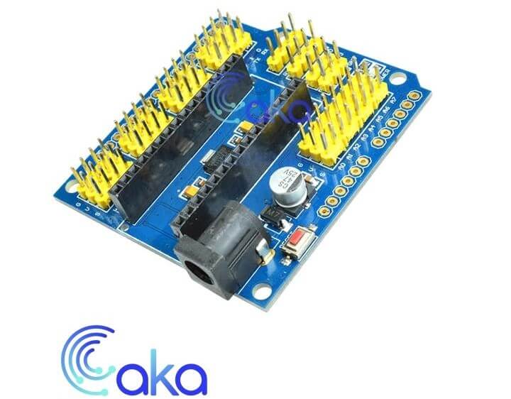Đế ra chân Arduino Nano I/O Shield V2 được sử dụng với Arduino Nano giúp chuyển từ kiểu chân của Arduino Nano sang kiểu chân và kích thước Arduino Uno, đồng thời mỗi chân của Nano sẽ kèm theo cặp tiếp điểm VCC / GND giúp dễ dàng kết nối với cảm biến, RC Servo, ..., ngoài ra đế còn tích hợp thêm cổng đầu ra UART, I2C và IC nguồn tạp áp 3.3VDC bổ sung.