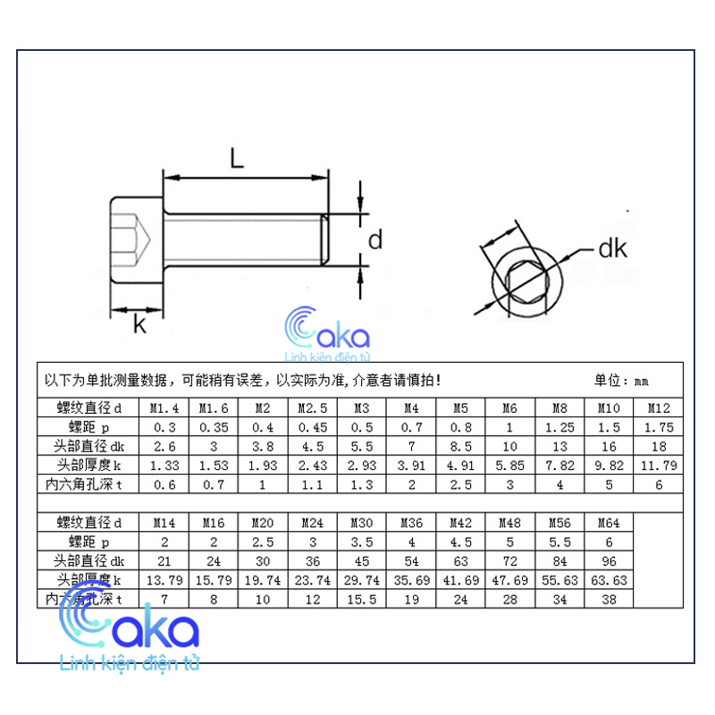 Bảng kích thước ốc lục giác M6