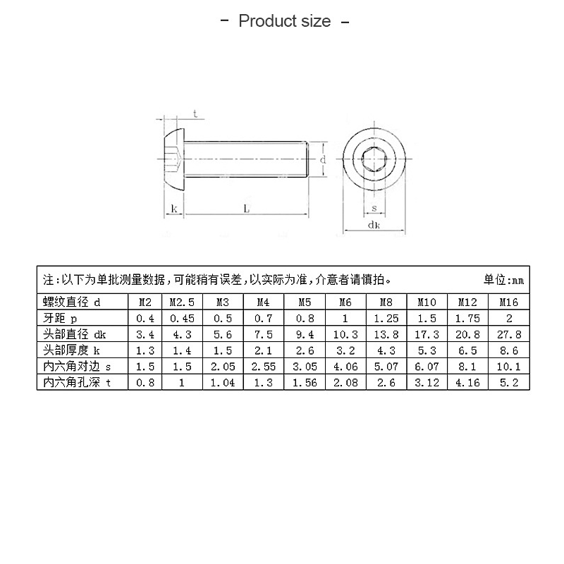Kích thước Bulong vít lục giác đầu dù M3 thép không ghỉ nhiều kích thước