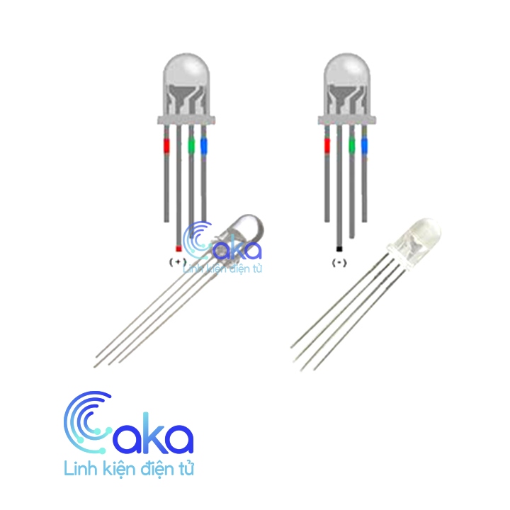 LED RGB 5MM 4 Chân khác với LED bình thường, led RGB có 4 chân, trong đó có 1 chân dương chung và 3 chân âm riêng cho từng màu (R - red - đỏ, G - Green - Xanh lá, B - Blue - Xanh dương). LED RGB thực chất là 3 con diode led bình thường dính chụm thành 1 khối mà thôi (vì độ sáng của LED RGB khá sáng cộng với hiệu ứng lưu ảnh của mắt người mà mình thấy được các màu sắc khác nhau).