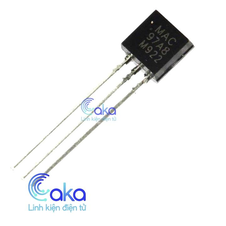 MAC97A8 TRIAC 0.6A 800V là một linh kiện bán dẫn làm việc như 2 Thyristor mắc song song ngược chiều, có thể dẫn điện theo hai chiều. Triac MAC97A8 được đóng gói theo chuẩn TO-92, gồm 3 chân.