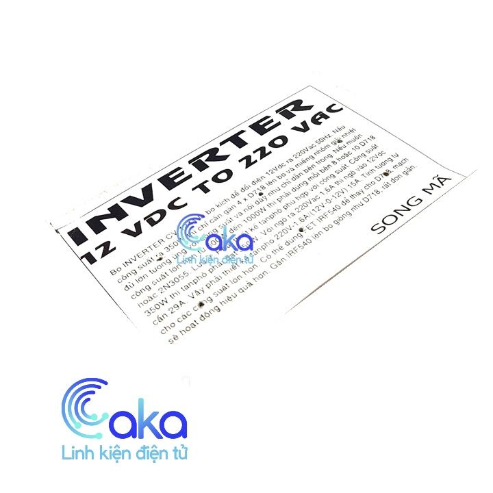 Mạch tăng áp Inverter 12V~220VAC là bo kích để đổi điện 12vDC ra 220vAC. Mạch được sử dụng với 4 Transistor D718 để cho ra công suất 350W.