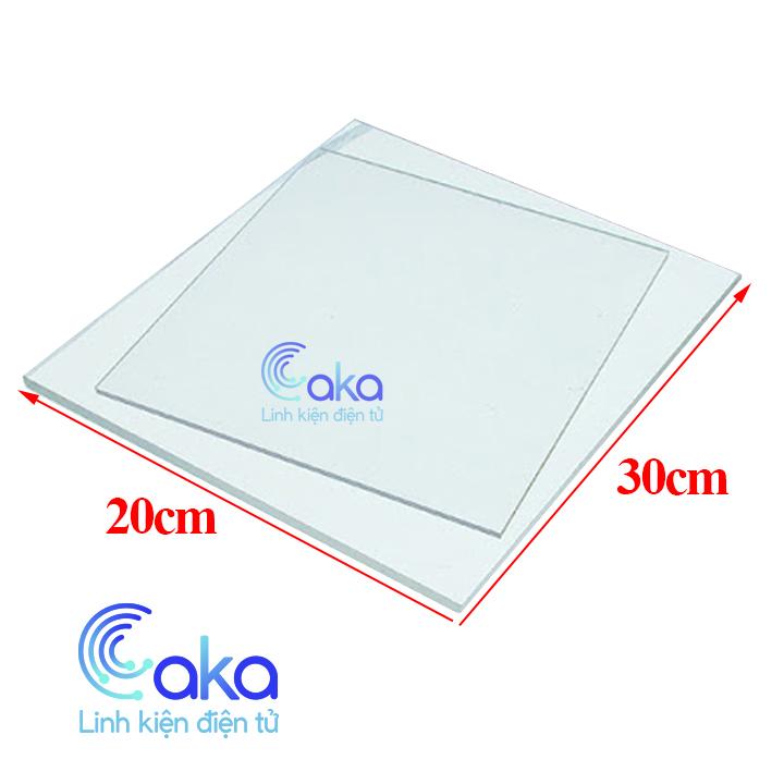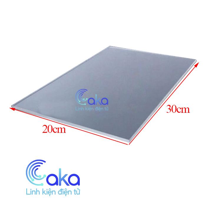 Mica trong khổ A4 có kích thước chiều dài x chiều rộng là 20x30, bề dày 2.5mm, Mica trong được sử dụng với nhiều mục đích khác nhau, khắc chữ, khắc laze, đóng hộp ....